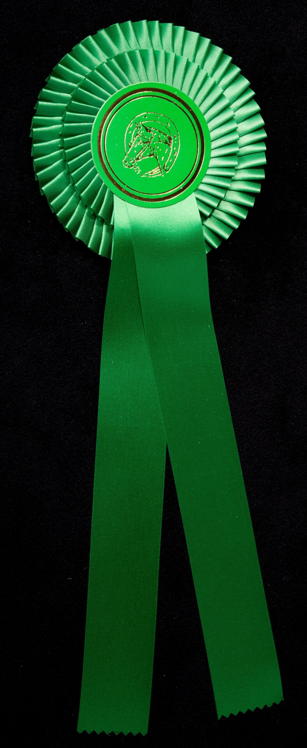 Plissierte Doppelrosette (individuell gestaltbar) mit kleiner, sehr eng und seitlich gelegter Falte, ca. 12,5 cm, Button 65 mm, 2 Bänder je 30 cm, Bandbreite 4 cm, Gesamtlänge ca 37 cm