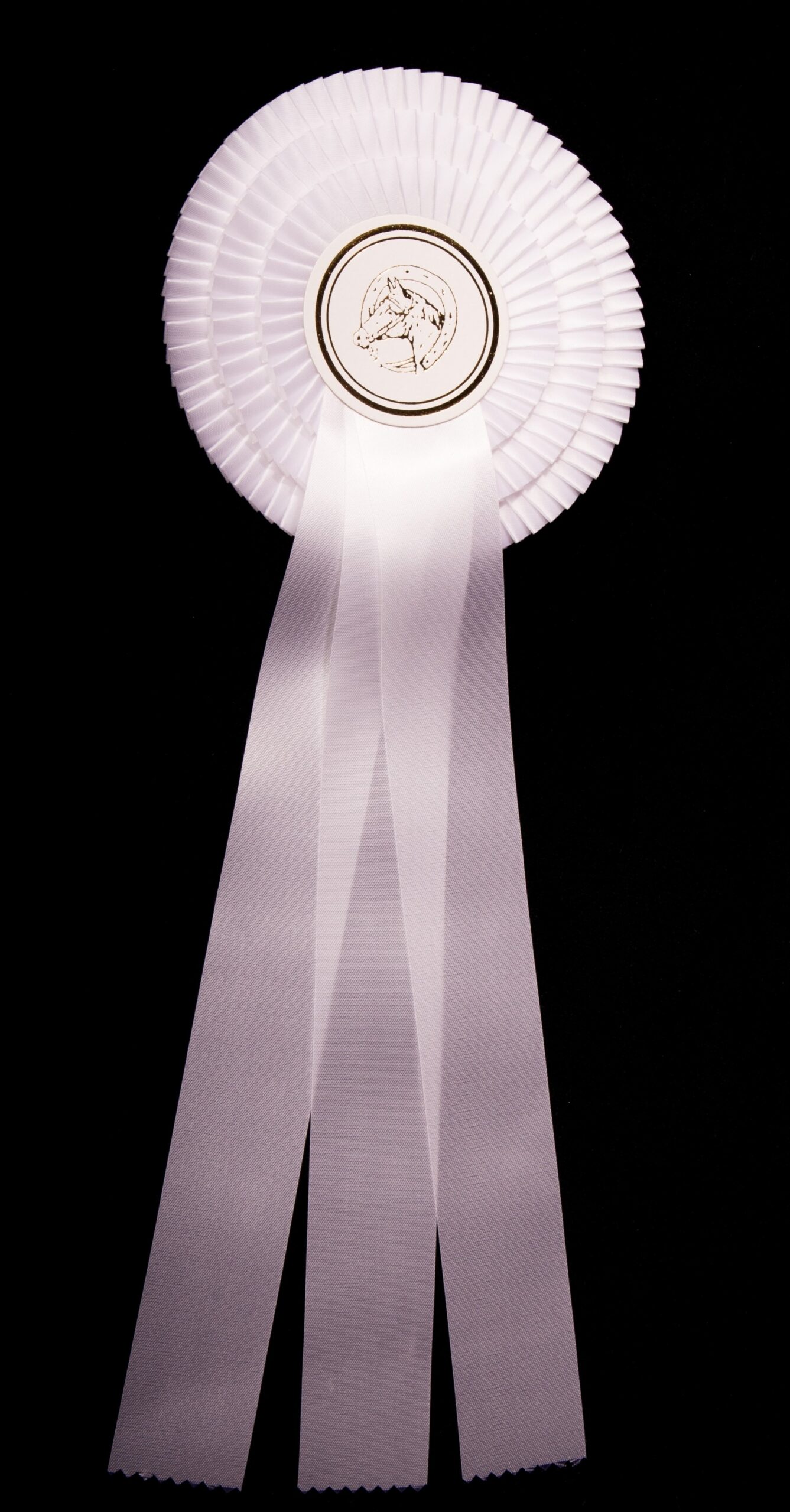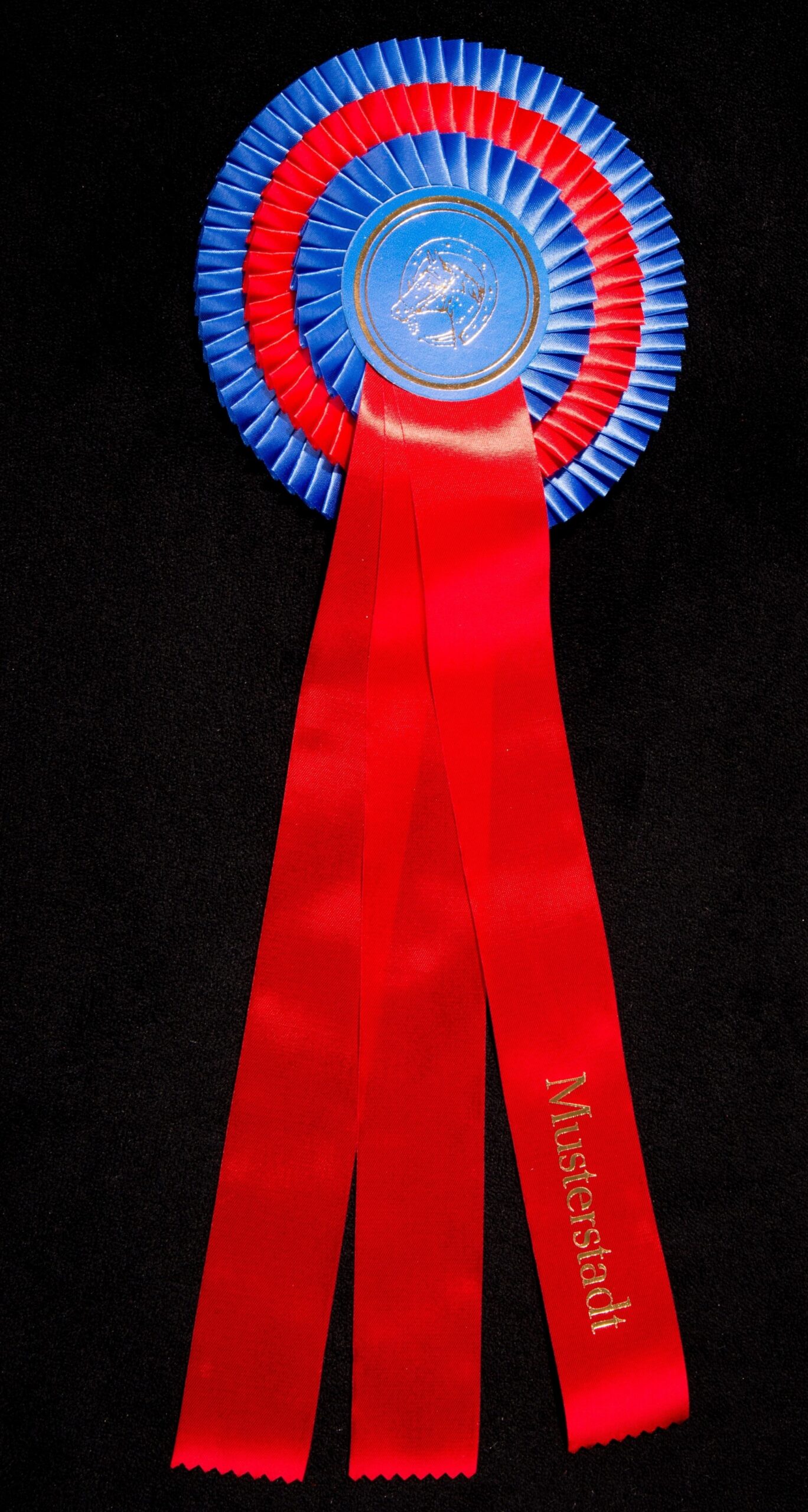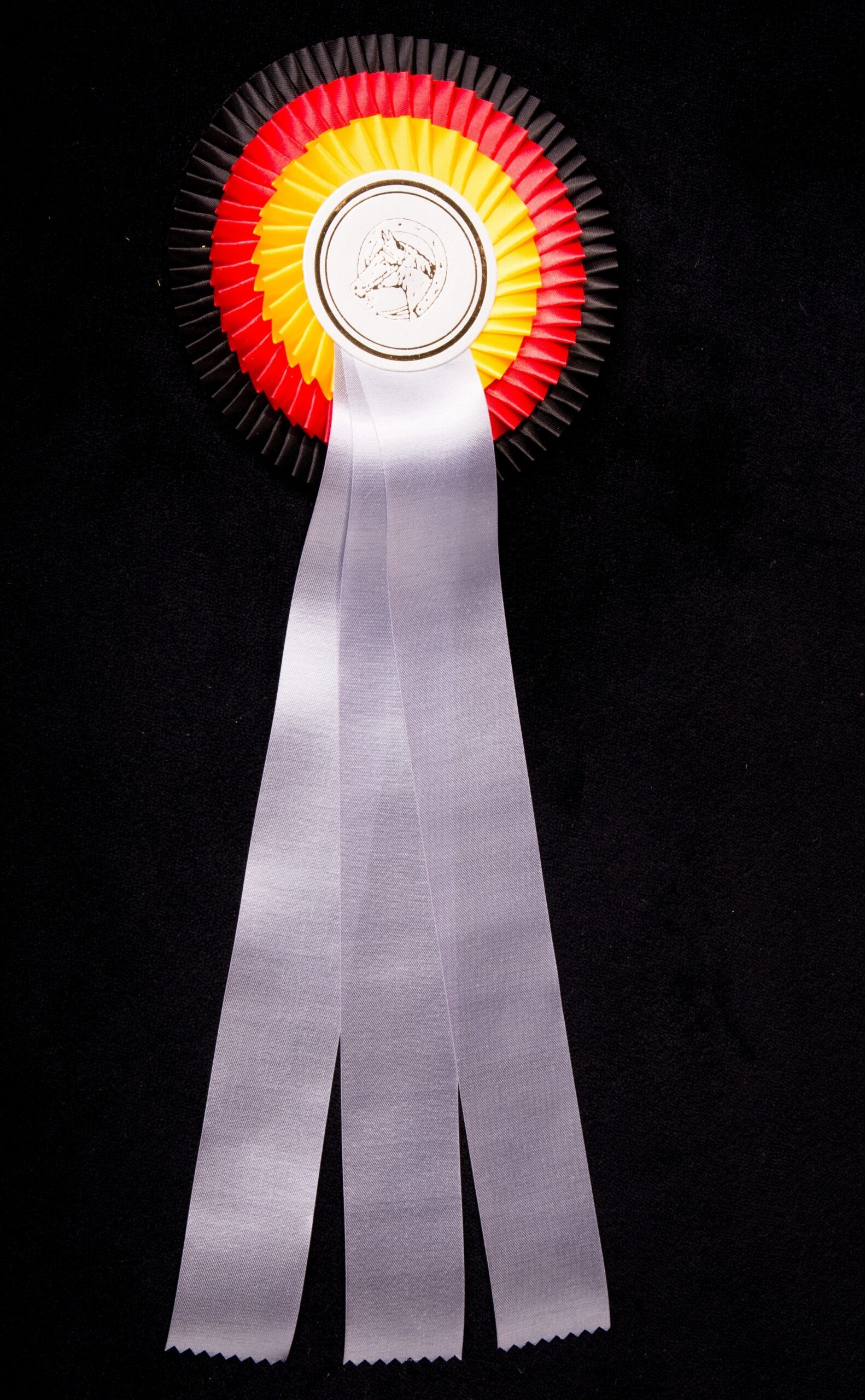 Plissierte Dreifachrosette (individuell gestaltbar) mit kleiner, sehr eng und seitlich gelegter Falte, ca. 16 cm, Button 65 mm, 3 Bänder je 35 cm, Bandbreite 4 cm, Gesamtlänge ca 43 cm