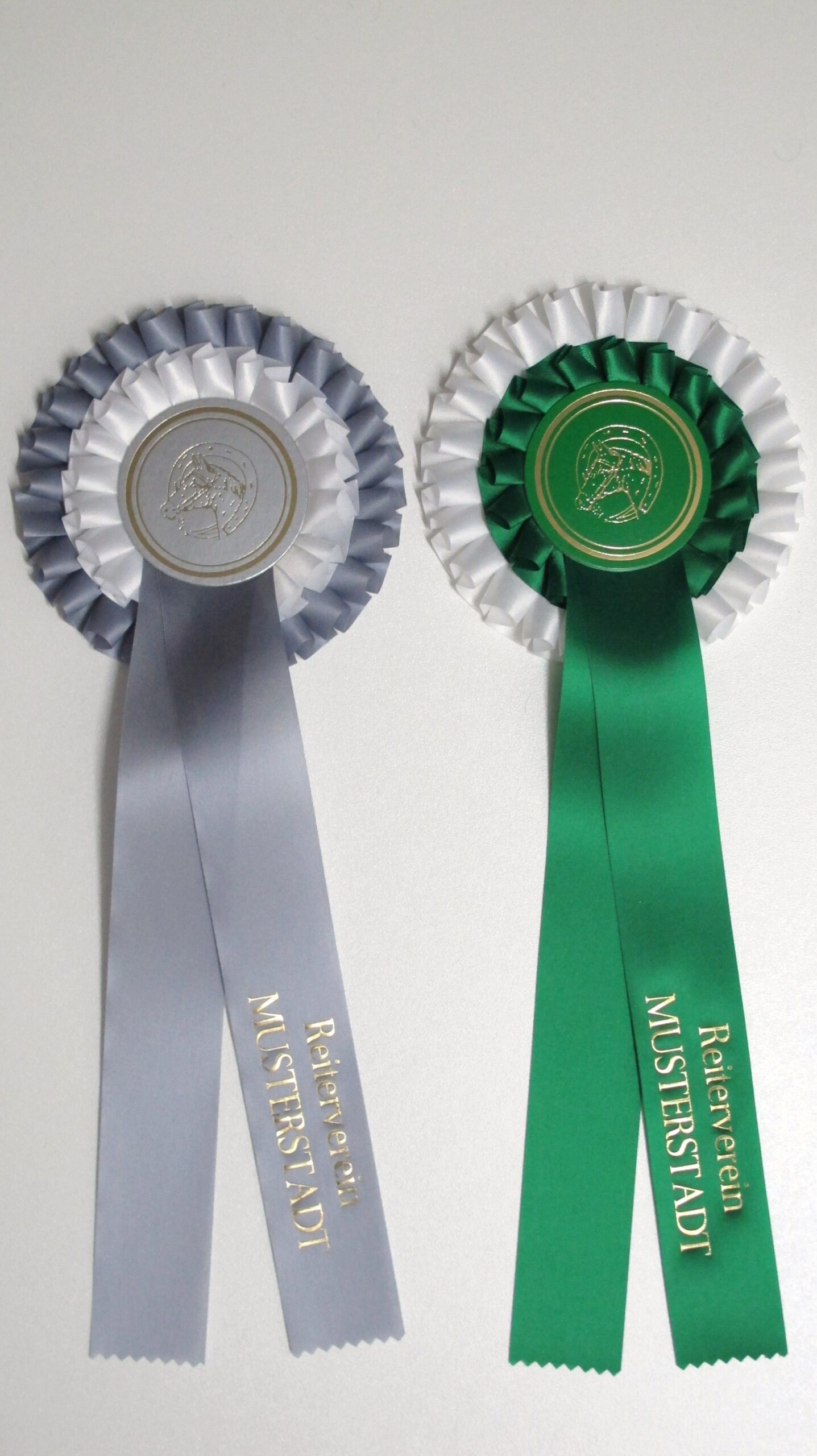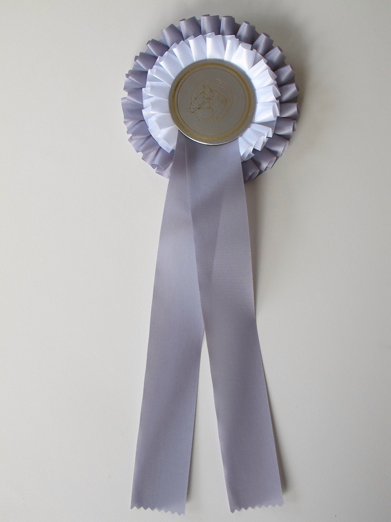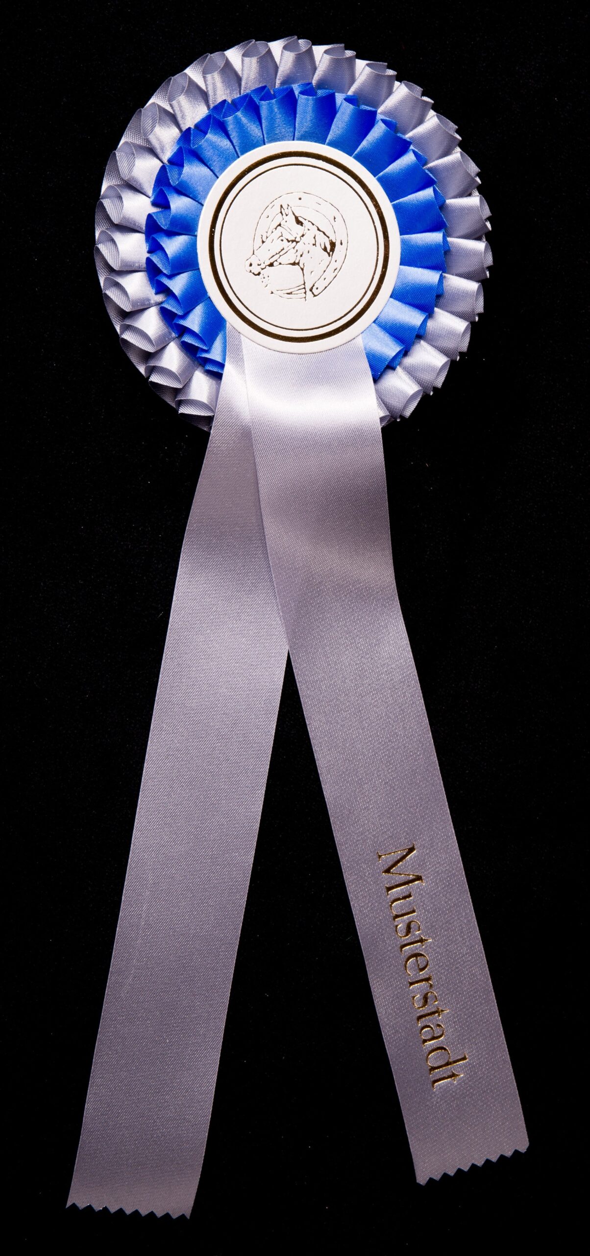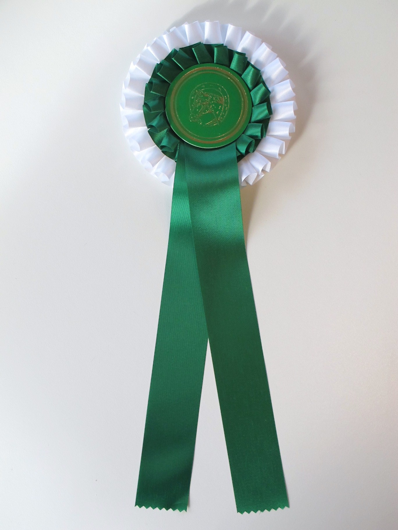 Plissierte Doppelrosette (zweifarbig) Ø ca. 13,5 cm Button 65 mm Ø 2 Bänder je 30 cm Bandbreite 4 cm Gesamtlänge ca 38 cm