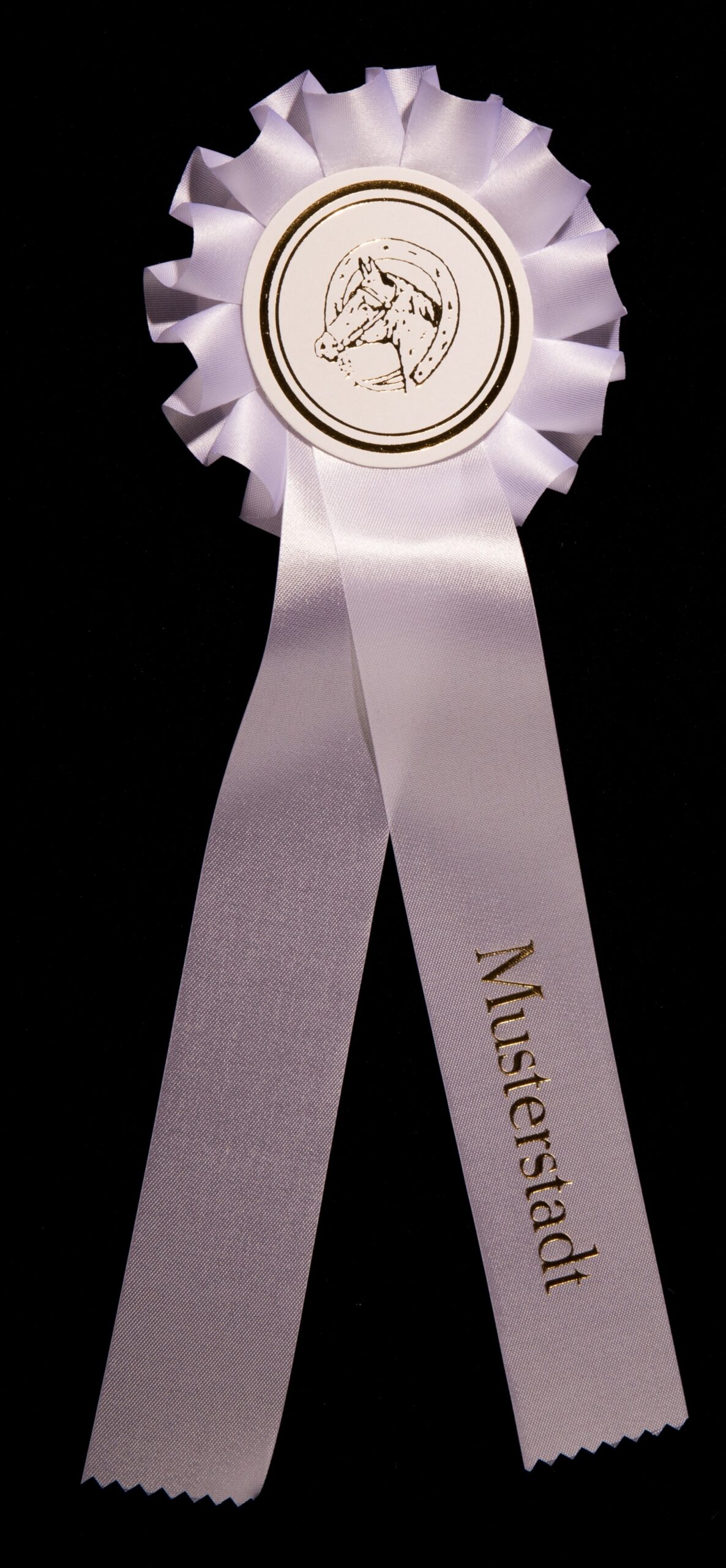 Plissierte Einfachrosette (individuell gestaltbar) mit großer vorderer Falte und einer kleinen Zwischenfalte, einem Durchmesser der Schleife von ca. 11 cm, einem Buttondurchmesser von 65 mm, 2 Bänder je 25 cm lang, Bandbreite 4 cm, Gesamtlänge der Schleife ca 30 cm