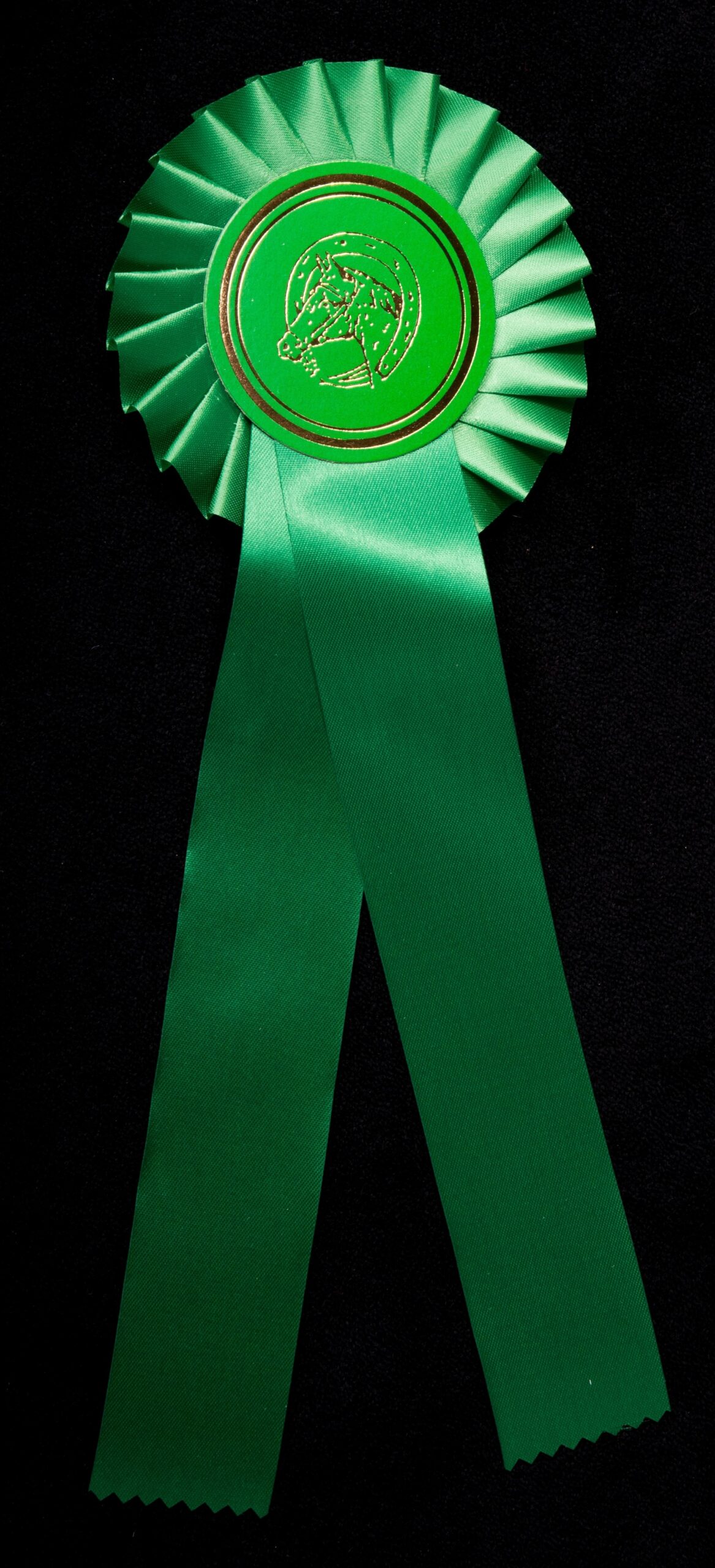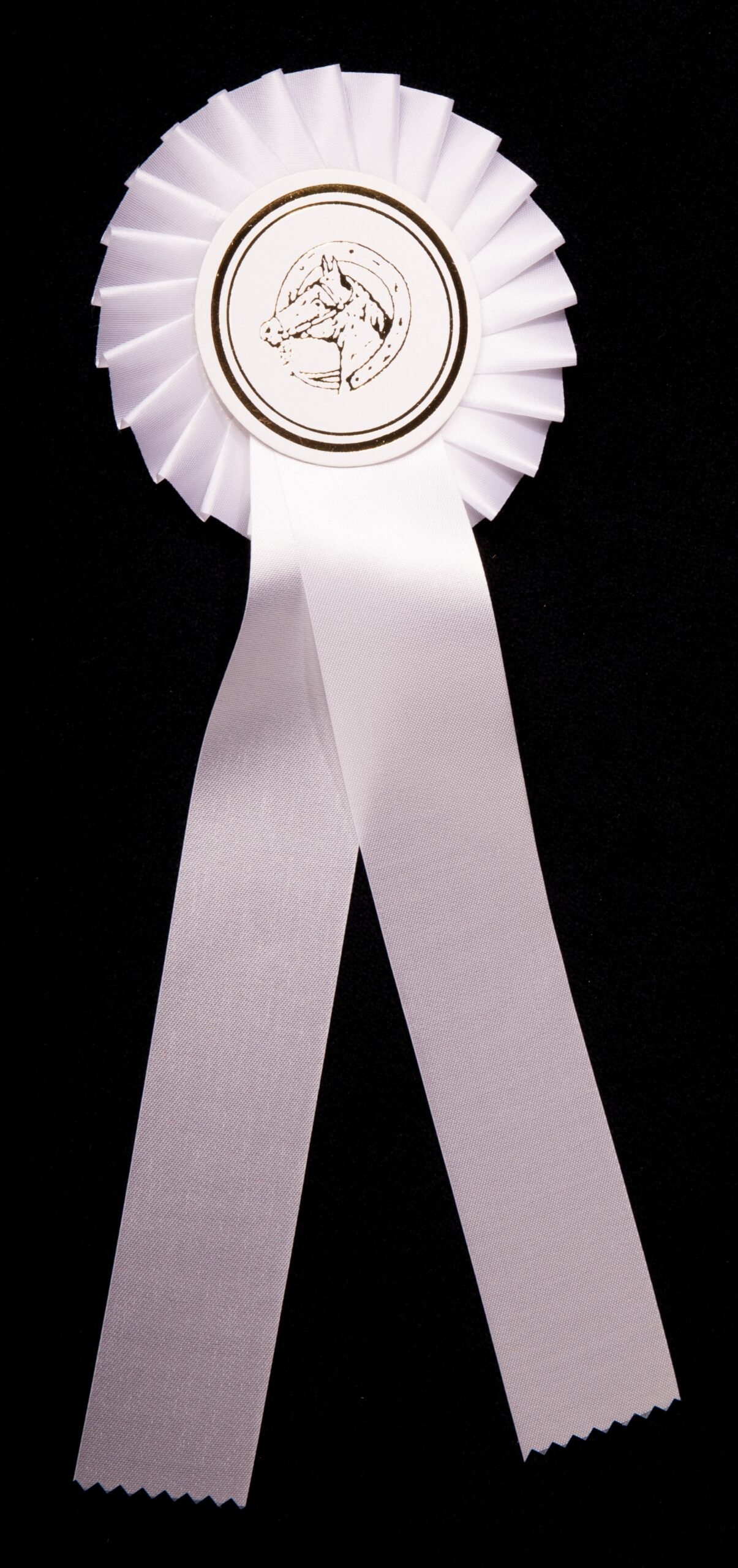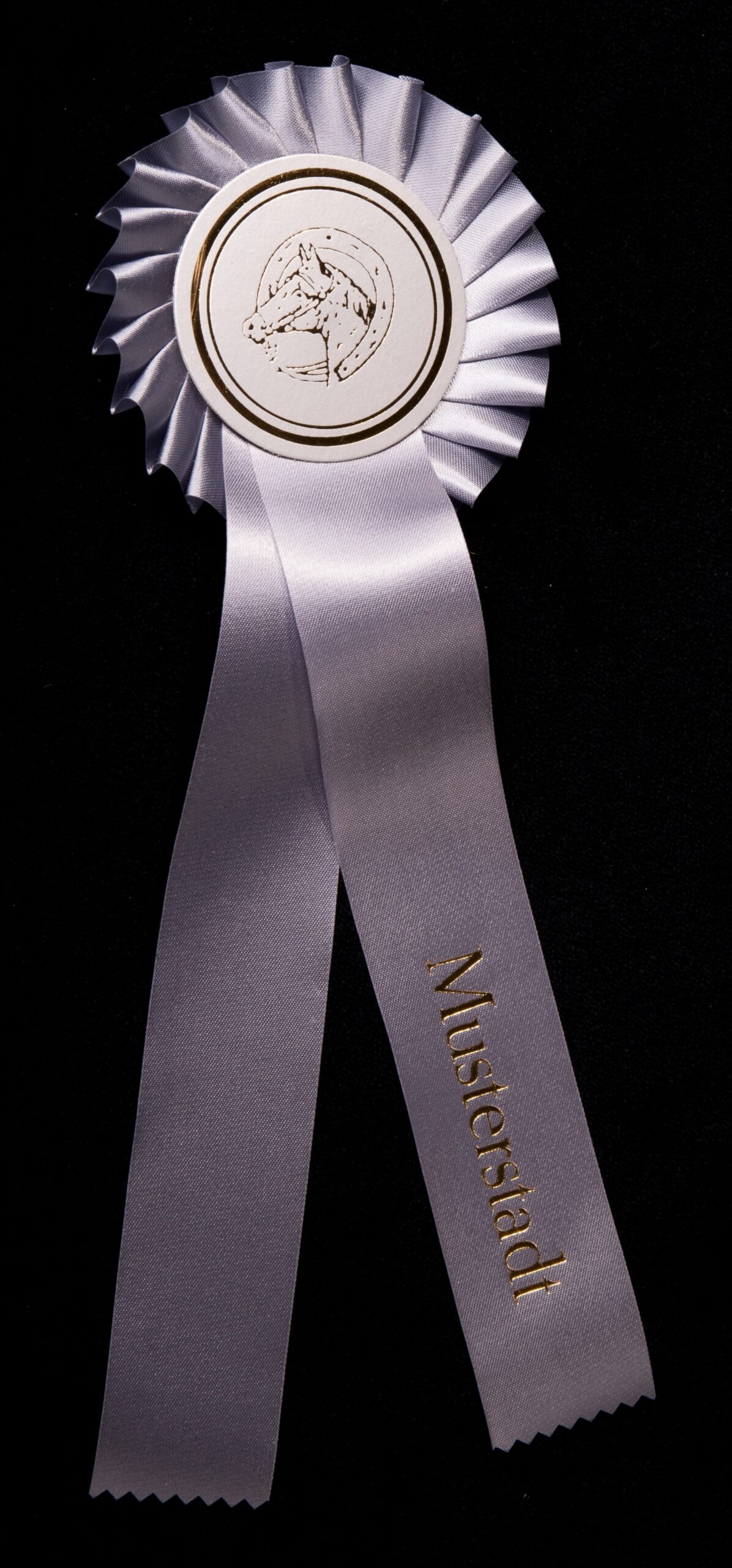 Plissierte Einfachrosette (individuell gestaltbar) mit kleiner, seitlich gelegter Falte, ca. 11 cm, Button 65 mm, 2 Bänder je 25 cm, Bandbreite 4 cm Gesamtlänge, ca 30 cm